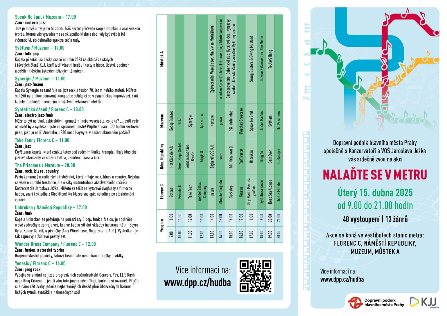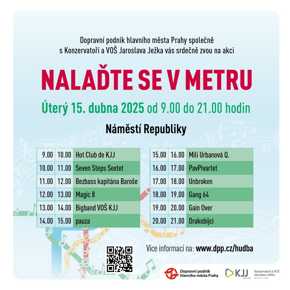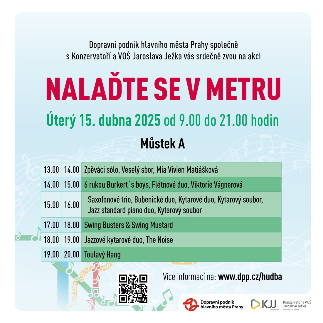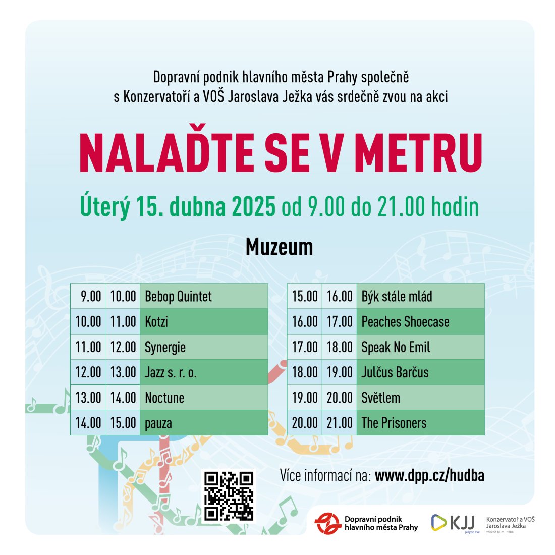 V úterý 15. dubna 2025 se na vás těšíme na akci Nalaďte se v metru, a to ve vestibulech stanic Florenc C, Náměstí Republiky (výstup Palladium), Muzeum A/C a Můstek A.